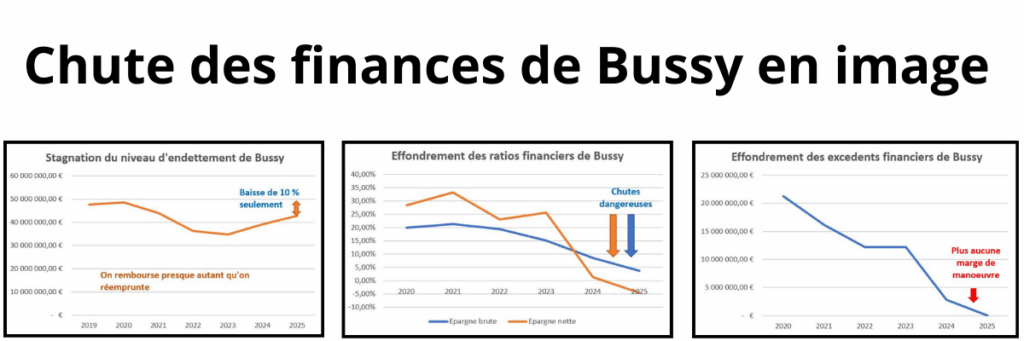 Nous sommes surpris.Comment le maire peut-il afficher sa satisfaction face aux finances de Bussy ? Certes, avant 2014, la situation était bien pire. Mais depuis quelques années, les chiffres s’effondrent. Il est temps d’en parler clairement aux habitants. Les alertes se multiplient : les finances de Bussy-Saint-Georges replongent. Pourquoi ? Conclusion : plus aucune marge … Lire la suite de Finances de Bussy : peut-on se contenter de dire que c’était pire avant ? Derrière le sourire affiché du maire, des finances en chute libre et un pilotage qui pose question !