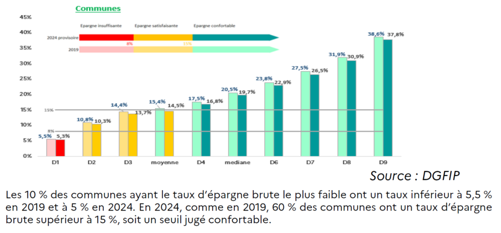 Intéressons-nous à ce que pense l’État des seuils critiques pour ce ratio. Ce second document émanant du gouvernement (Conférence financière des territoires : Situation 2024 et perspectives) montre qu’en dessous de 5 %, on est considéré comme une commune qui ne dégage pas assez d’épargne pour assurer son avenir. Bussy-Saint-Georges se retrouve donc dans les 10 % des communes de France ayant une épargne insuffisante pour appréhender l’avenir de façon sereine. Ce n’est pas nous qui l’inventons !!
