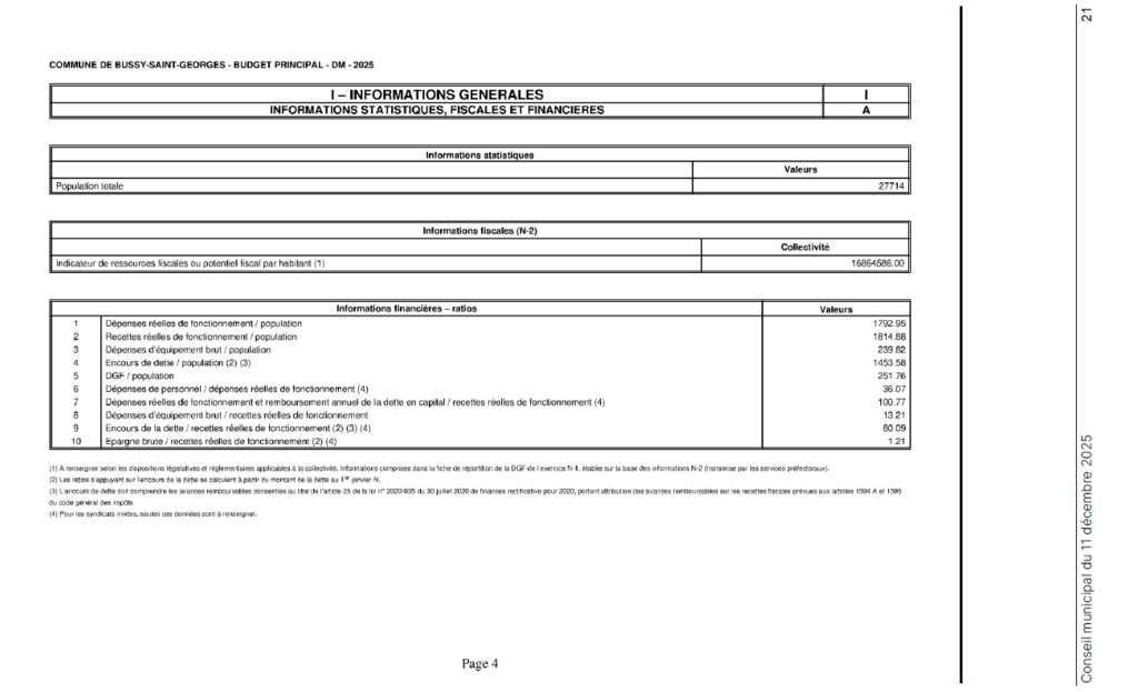 Voici la page 21 du document transmis par l’équipe municipale en place pour le Conseil Municipal. Il s’agit de la page 4 du budget. Le logiciel de la mairie calcule automatiquement le ratio n°10 : Épargne Brute/recettes réelles de fonctionnement : 1,21 %. Il s’agit du taux d’épargne brute de Bussy-Saint-Georges à la fin de l’année 2025.