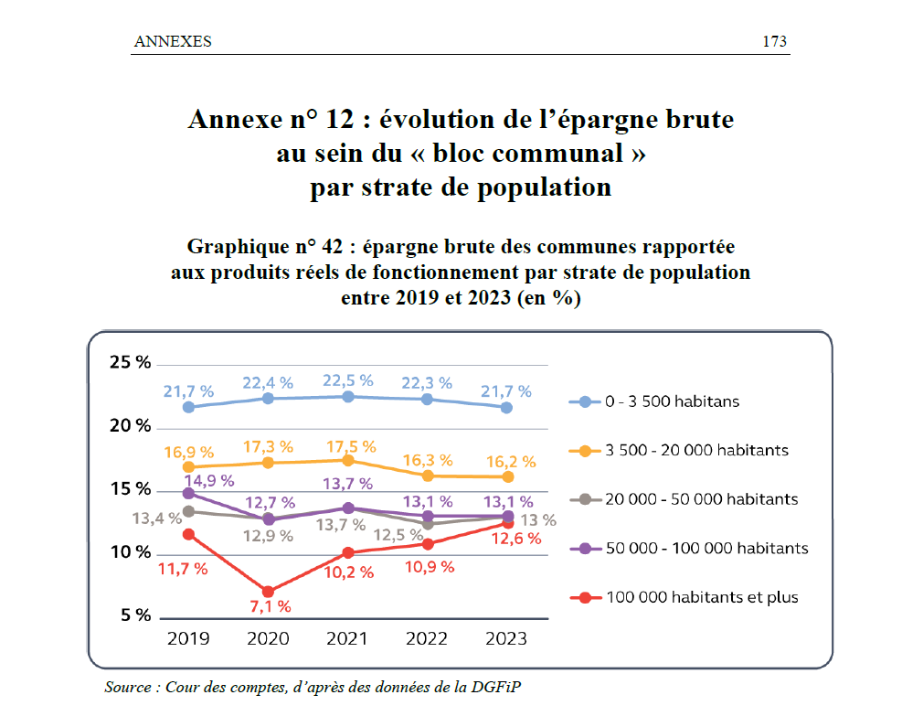 D’abord, intéressons-nous à la Cour des comptes, Le « taux d’épargne brute » est considéré comme un indicateur si important que chaque année, la Cour des comptes l’utilise pour comparer la santé financière des villes entre elles et pour calculer des moyennes en fonction du nombre d’habitants comme le montre ci-dessous la page 173 du rapport 2024 de la Cours des comptes sur les finances publiques locales.