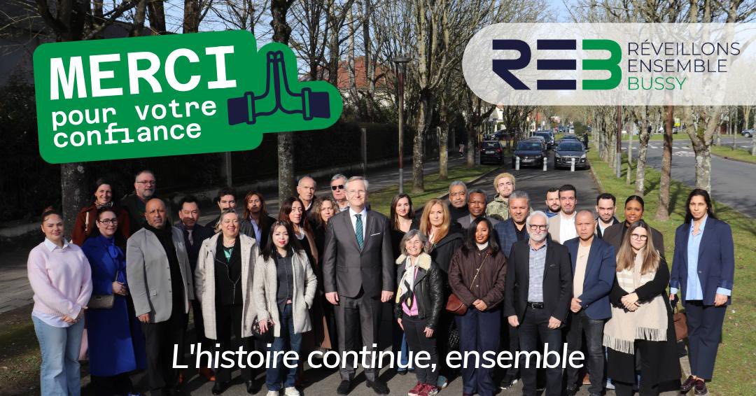 Nous tenons à adresser nos remerciements les plus sincères à toutes celles et ceux qui ont accordé leur confiance à la liste Réveillons Ensemble Bussy (REB) lors de ces élections municipales.