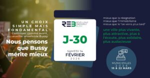 - Le 14 février J-30, le 15 mars un choix simpleDans 30 jours, vous aurez entre les mains un choix décisif pour l’avenir de notre ville. Un choix simple, mais fondamental : Continuer comme avant, ou réveiller ensemble Bussy.