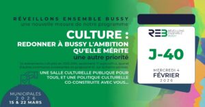- Culture : redonner à Bussy l’ambition qu’elle mérite – Une autre prioritéLe constat est sans appel. En 10 ans, la culture a reculé à Bussy-Saint-Georges. 54 événements culturels en 2013-2014, seulement 17 aujourd’hui, quand d’autres communes avoisinantes en proposent 41 sur la même période. Comment accepter que Bussy Saint-Georges, ville bien plus dense que celles voisines, demeure un désert culturel ?